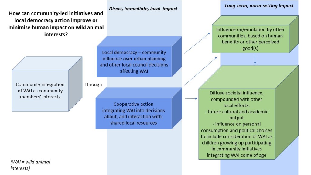 the public, through political, economic, and social participation. Let us specifically consider the role of communities and democratic engagement at the local level, which is less formal than higher institutions (Rahman et al. 2017, p. 824) while still being capable of playing a significant societal role in improving human impacts on the interests of wild animals.